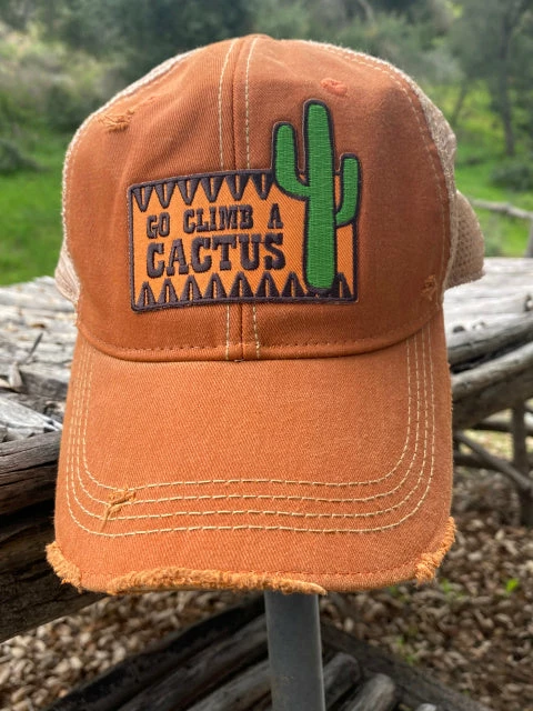 If a cactus is featured – you’re hip! Vintage distressed style cap. “Go Climb A Cactus” and a cactus design is in a rectangle.