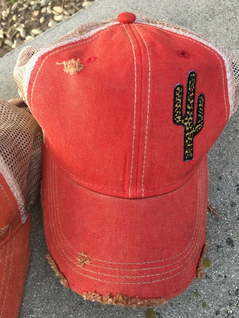 Vintage distressed style cap. Front design features a Leopard Spot Saguaro Cactus.