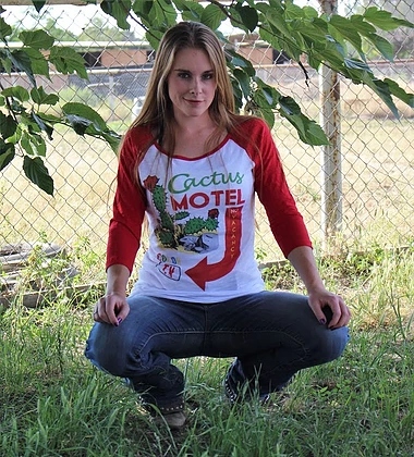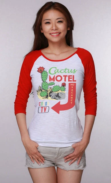 Cactus Motel 3/4 sleeve “slub” burnout baseball tee with comfortable red raglan sleeves. Very cool vintage look. Printed with organic inks so the finish is soft.