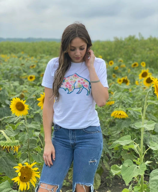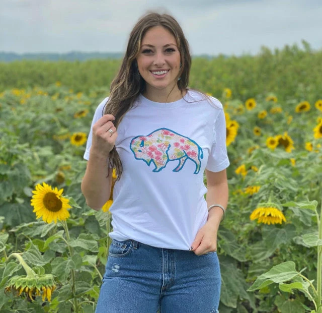 Buffalo Tee with Rose Spots Junior Fit on soft slub burnout fabric, crew neck, double print. Designed, printed, and produced in the USA.