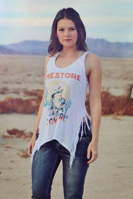 Take a trip through the American Southwest with this beautiful vintage-inspired Dimestore Cowgirl Fringed Tank. This fringed tank looks perfect paired with your favorite jeans, shorts or skirt!