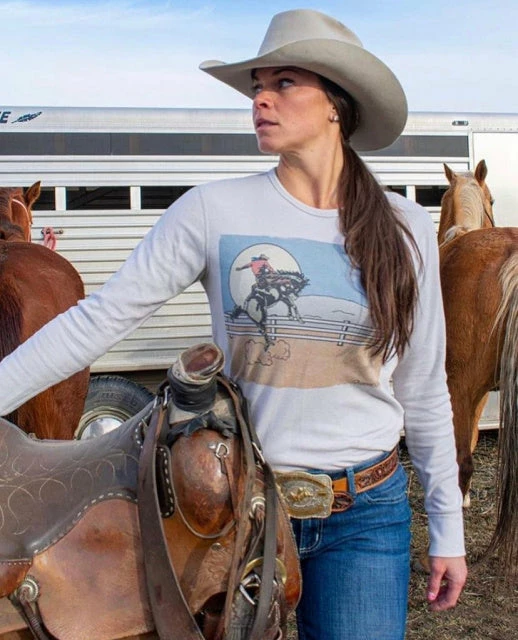 Original Cowgirl Clothing thermal “Moonlight Cowboy” is a midnight ride turned rodeo…beautiful graphic image and colors.