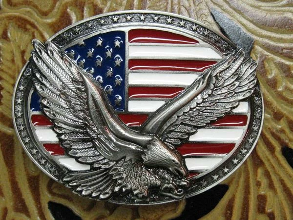 From the folks at Rockmount Ranch Wear comes this Western inspired trophy buckle featuring the iconic Eagle in Flight against the American Flag background.