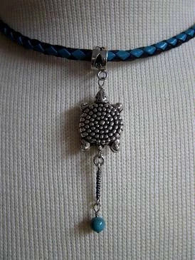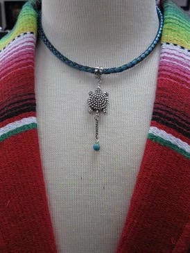 Turtle with Turquoise Bead is a charming necklace for everyday. Sterling silver turtle with suspended turquoise bead is suspended from a hammered sterling silver bail off a 16″ braided black and turquoise leather necklace.