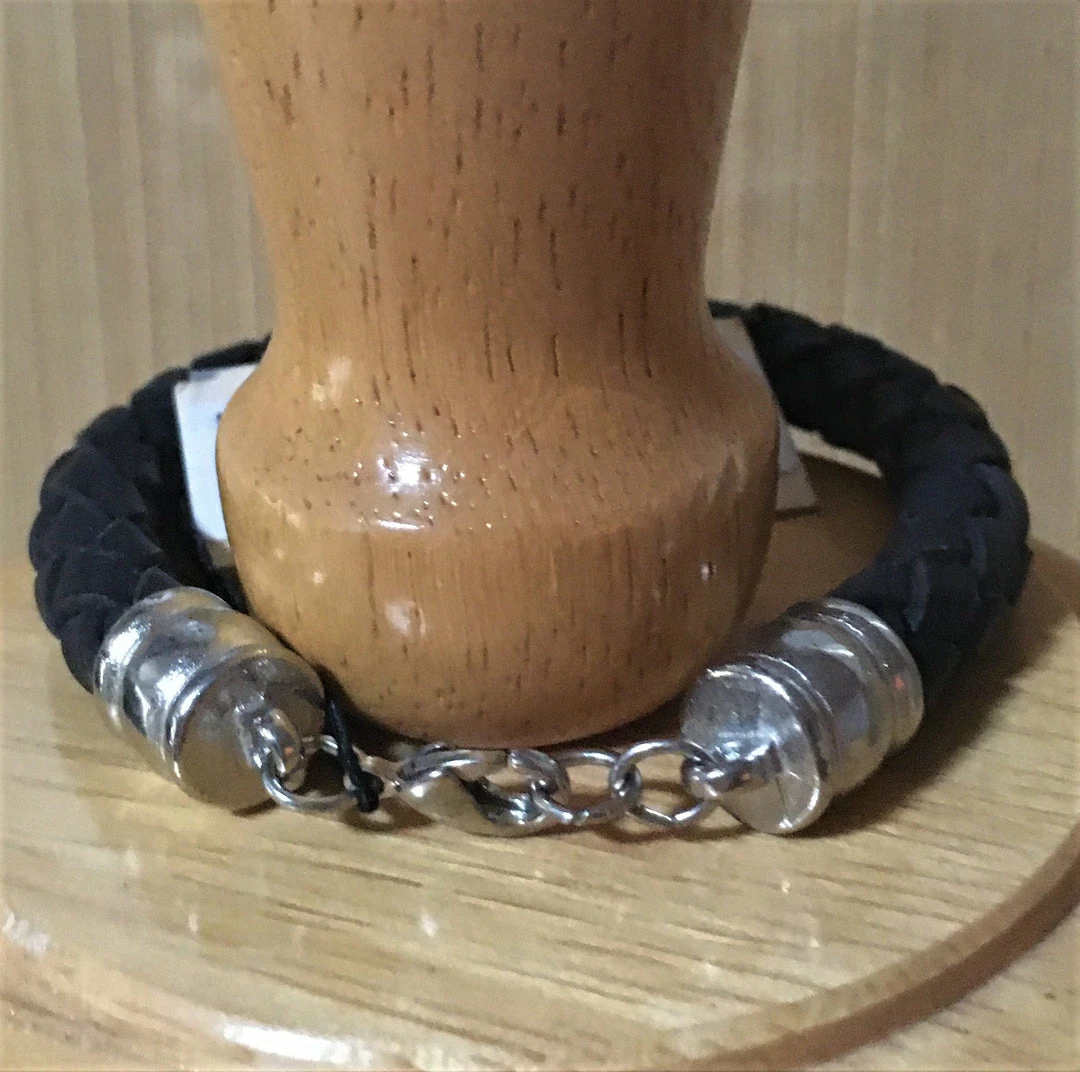 Braided black bracelet/cuff with silver ends and clasp. Measures 6.5″ in length, including silver tips. Handcrafted in the USA.