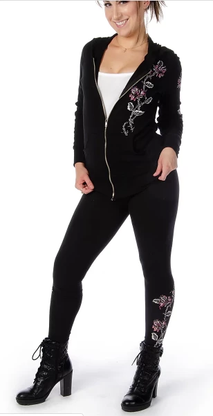 Liberty Wear Women’s, Rhinestone Barbed Wire & Roses, smoothing and figure flattering mid-rise legging with rhinestone roses and barbed wire design along the outer leg. Pairs perfectly with Barbed Wire & Roses hoodie, #118103.