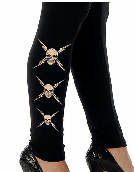 Liberty Wear Women’s, Rhinestone Three Skulls & Lightning, smoothing and figure flattering mid-rise legging with rhinestone three skulls & lightning design along the outer leg.