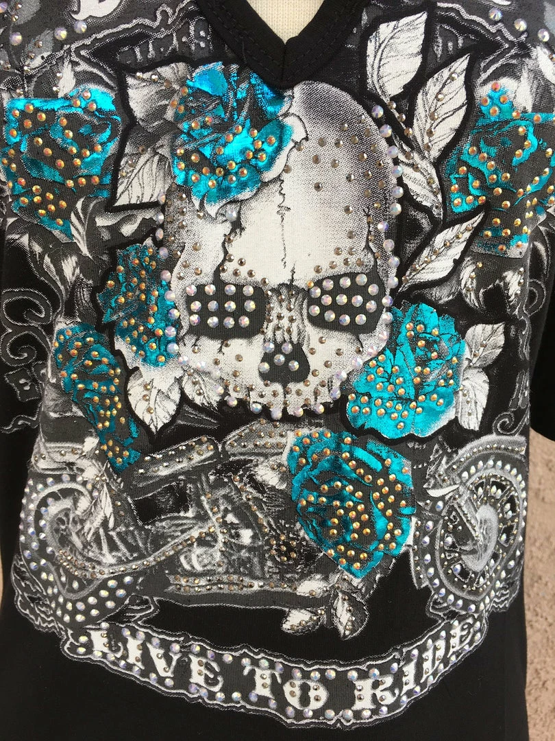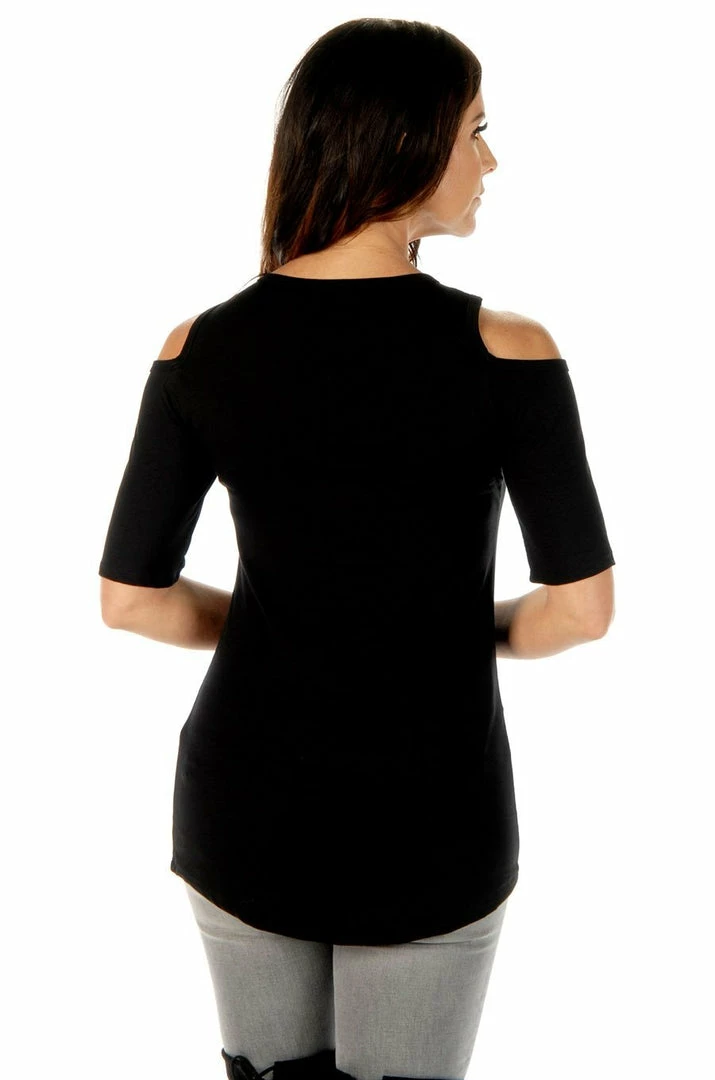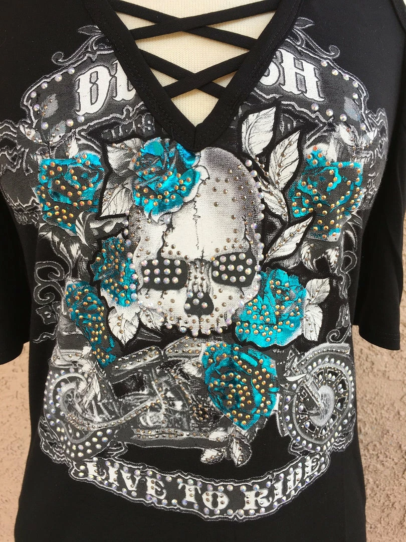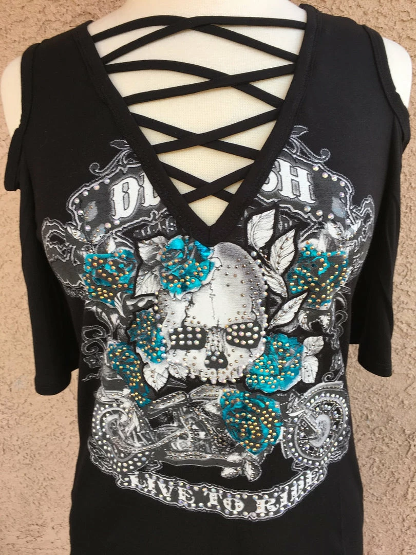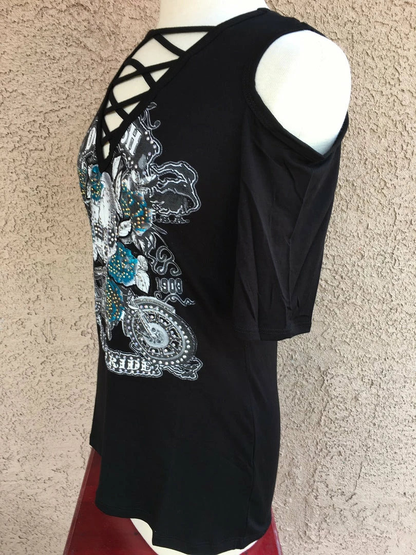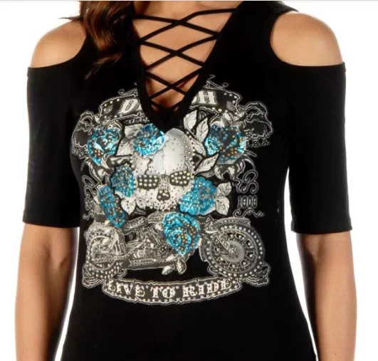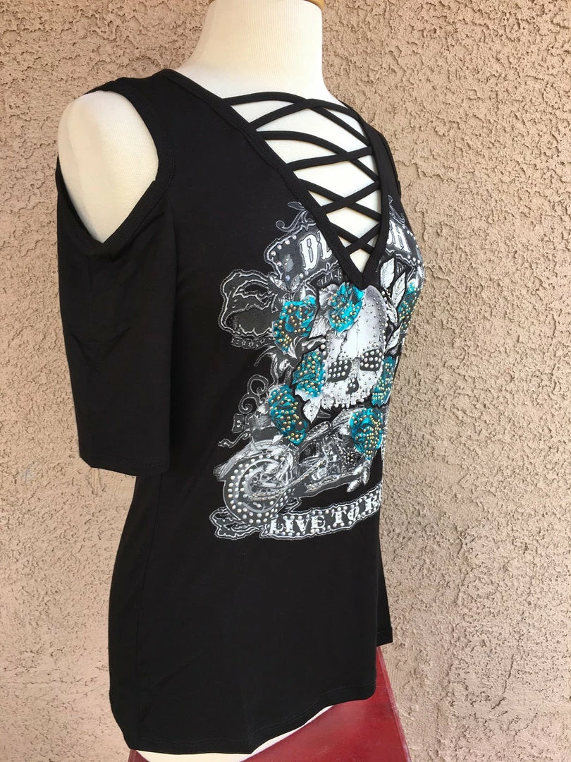 Liberty Wear Women’s Bikers, Booze, Babes, cold shoulder elbow length sleeve top with lace up front is cutting edge!