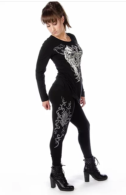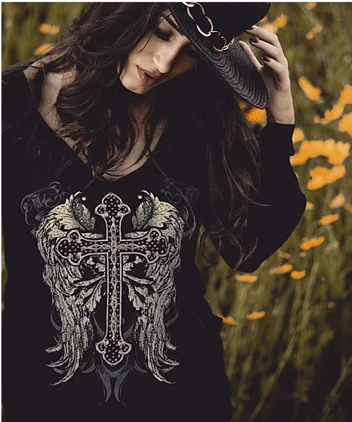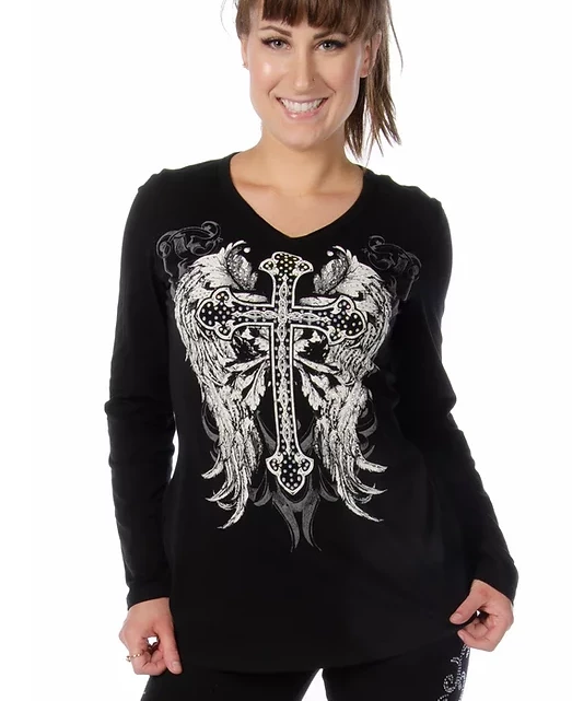 Women’s Black Souls is a bold & blinged out Celtic cross design on Liberty Wear’s basic long sleeve v-neck.