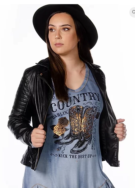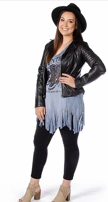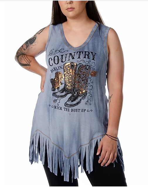 Liberty Wear’s, Country Darlin’, is perfect for the dance floor. Kick the dust up in this tunic length fringe tank. With accent stitching and foil detail, this ones a head turner!