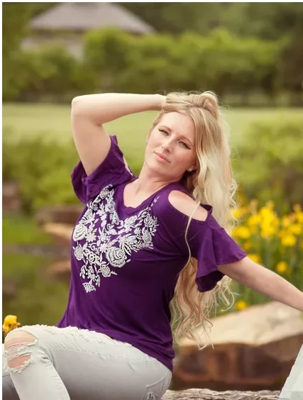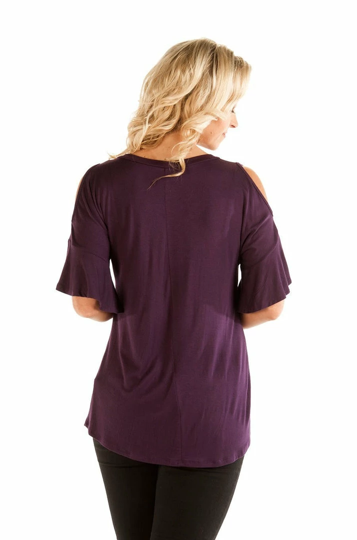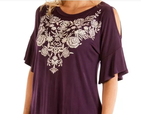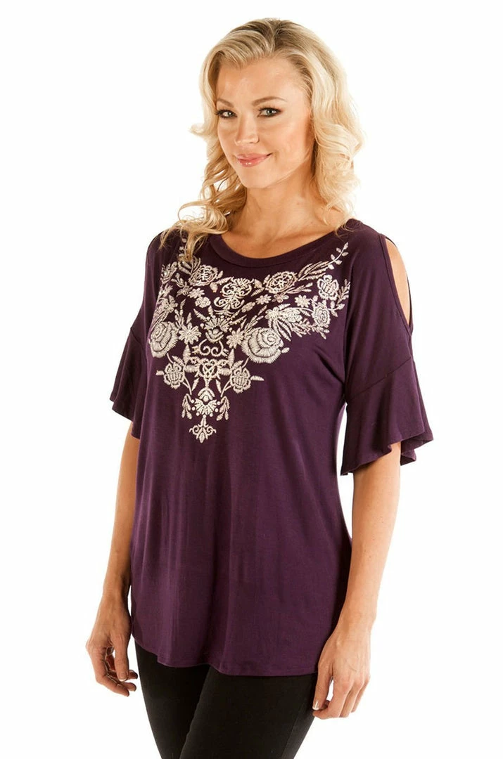Liberty Wear for Women, Dripping In Diamonds, pretty top will add a touch of elegance to your collection. Cold shoulder, embellished, tear drop floral neckline print top in majestic eggplant or elegant black. A popular boho style with a flattering design for all body types.