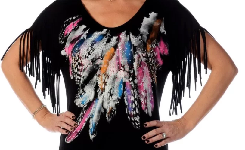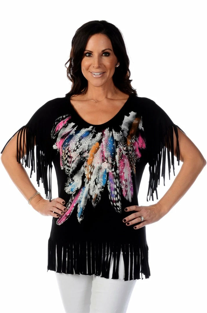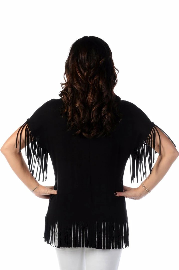 - Black body, short sleeves with fringe