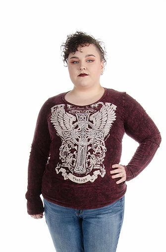 Liberty Wear, Freedom Long Sleeve, design features a winged cross with the word “Freedom” boldly displayed above it. Cross and wings are illuminated with crystal accents. A popular style with a form fitting body, flattering design for all body types.