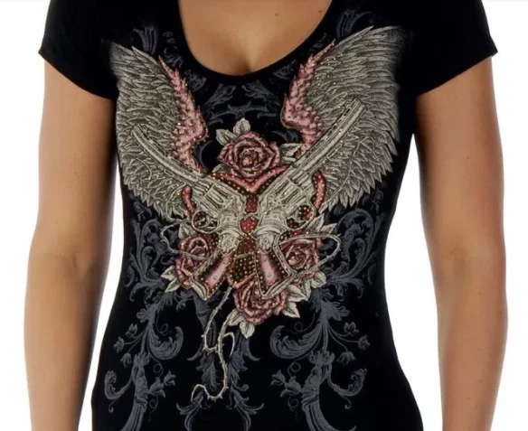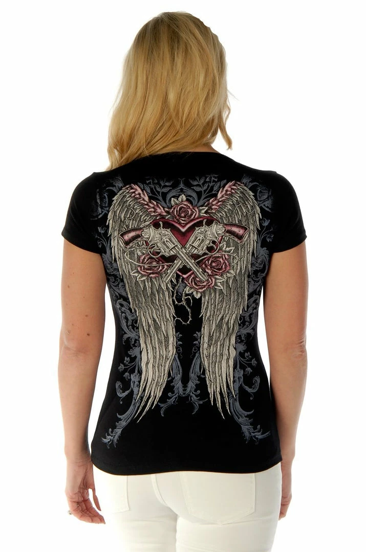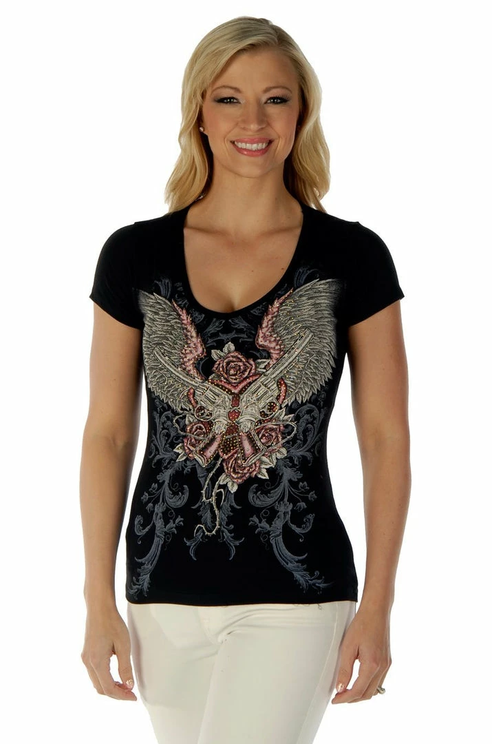 Women’s Guns & Wings short sleeve scoop neck top features an intricate design with pistols & wings.