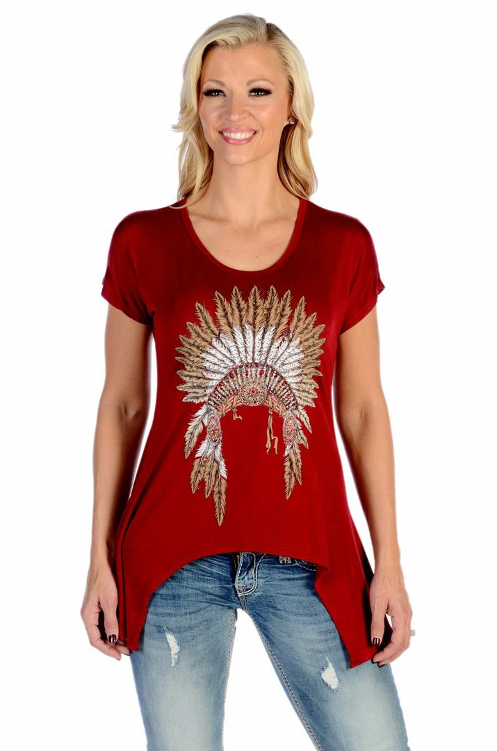 Striking Native American inspired design on front, plain back. Hi-low hem is perfect for all body types.