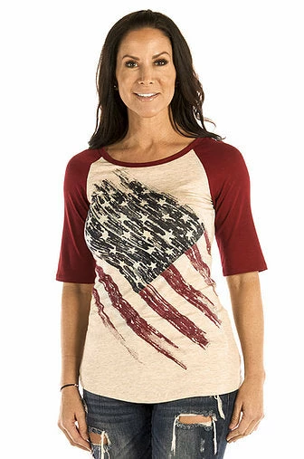 Show your Patriotic Pride with Liberty Wear’s casual, American flag baseball tee in a deep red and vintage oat color.