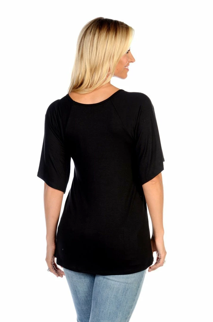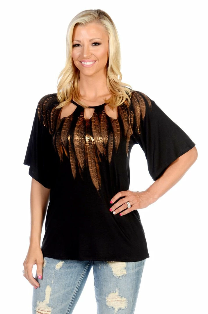Striking Women’s Peekaboo Feathers is an elegant tri-cut neck lacing tunic with glistening copper feathers and loose sleeves. Loose-fit top has a hung copper feather imprint from shoulder to shoulder, tri-cut neck lacing, and loosely hanging short sleeves. This tunic is fashionably appropriate for a night out.