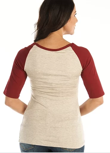 Sublimated steer skull graphic, Rowdy Rose, is offered in two colors: heathered oat with burgundy or turquoise half sleeves.