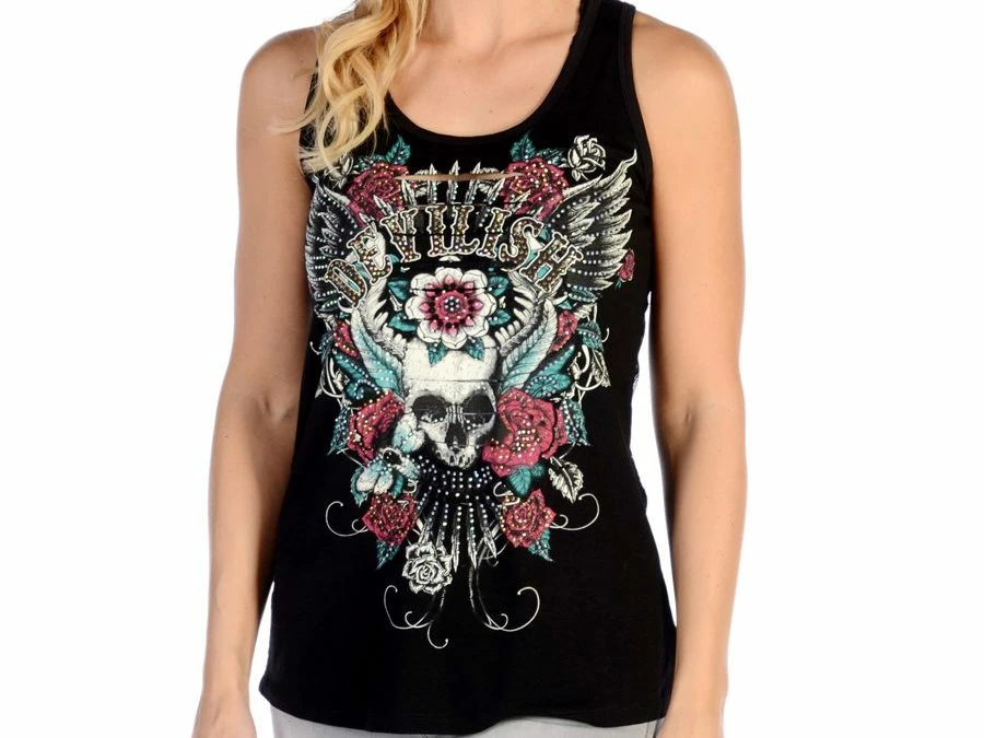 A rebellious rock n’ roll top that is so popular, Devilish Lace Back Tank, will become your favorite. Centered with a skull with wings and roses surrounding it, this top is lined with rhinestones paved with the word Devilish above. An elegantly woven lace back gives this edgy top an even bigger kick to it!