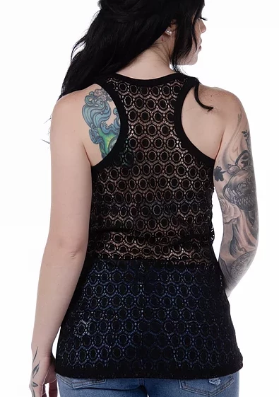 Liberty Wear for Women, Gibson FV, sleeveless tunic. Showoff your edgy side in this wing, guitar, and roses graphic, slit front tank with lace back.