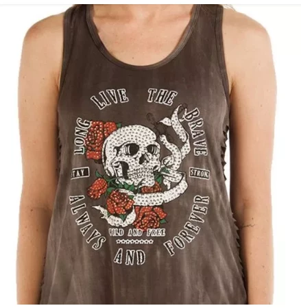 Long Live The Brave, a casual, edgy and cool tank with rhinestone embellishment on the rose and skull graphic. A soft mineral wash makes every individual piece unique and worn. The lace up back also makes an alluring, sexy quality.