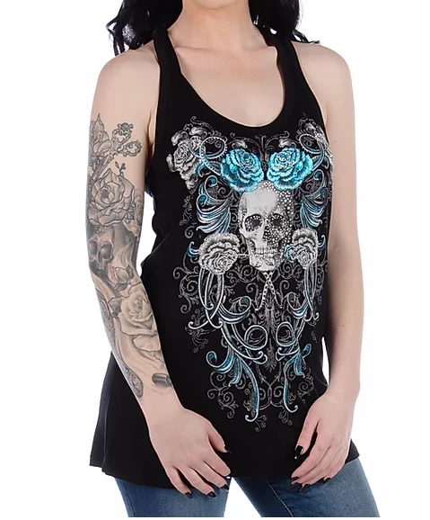 Liberty Wear for Ladies’ edgy tank, Romance Is Dead, has beautiful blue foiling, a skull and roses with a twist back.