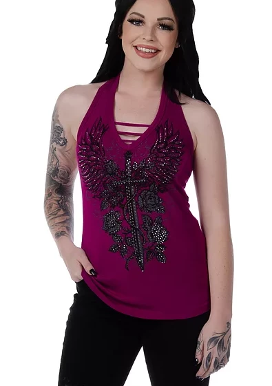 Turn heads in Liberty Wear’s new, Vengence, a stunning magenta halter with a striking wing and dagger graphic, rhinestone embellishements, and striking slit back.