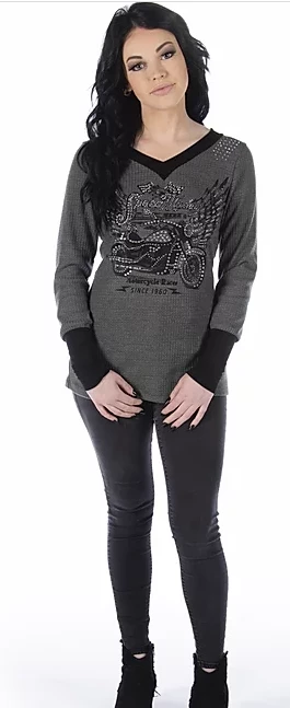 Speed Master Thermal is a comfortable and edgy, waffle knit, long sleeve thermal with black contrasting binding and cuffs, silver rhinestones on the front yoke and graphic. Features an eye catching black wings and motorcycle graphic.