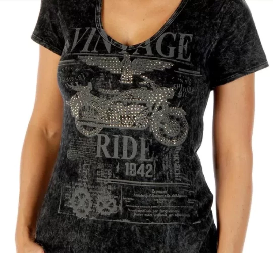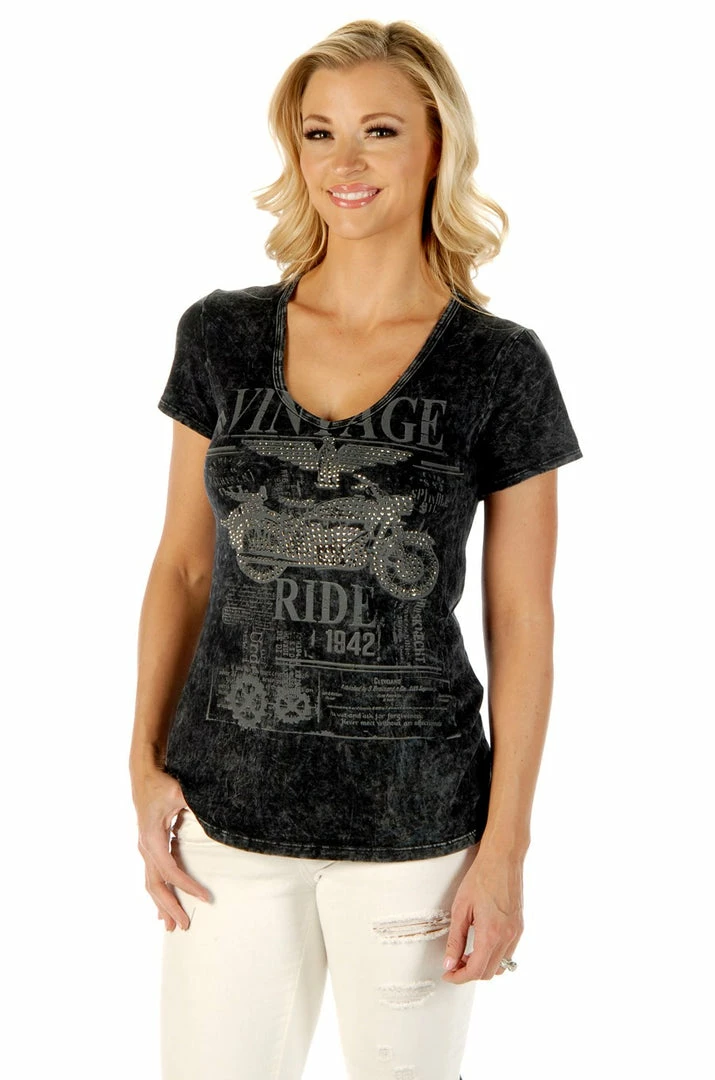 Liberty Wear Women, Vintage Ride, T-shirt features an image of a cool vintage motorcycle, gears, an eagle, and the words 1942 and Vintage Ride. Bedazzled with bling accents. Throw on this great relaxed v-neck tee with you leather jacket and biker boots. This vintage top has a worn in, loved look with its mineral wash and distressed and faded graphic featuring an embellished cruiser.