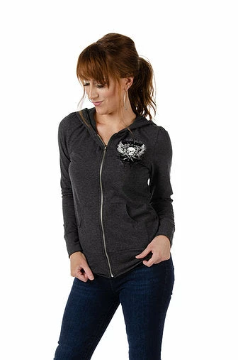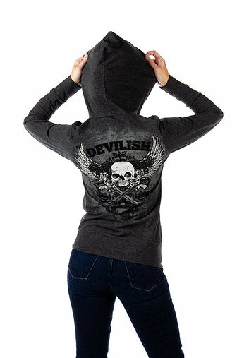 Liberty Wear Ladies’ hoodie, HARLOW, is of heathered charcoal, heavy weight cotton zip jacket. Features Devilish skull and guns back graphic and silver rhinestone embellished Devilish skull, front chest graphic.