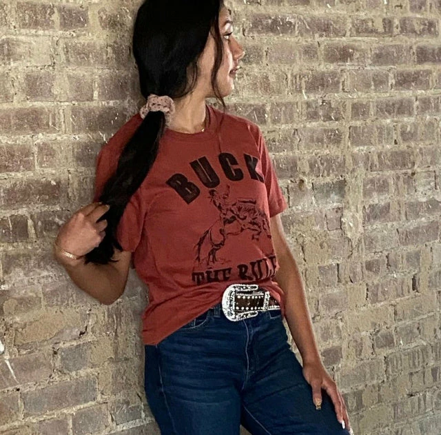 Buck The Rules tee shirt is an Original Cowgirl Clothing design. This soft tee adds an old-school rodeo touch to your everyday sassy country girl style This tee will become one of your go to favorites. “Buck the Rules” is the chapter title from the book “How to Rope a Kick Ass Life.” Used with permission. Designed, printed, and produced in the USA.