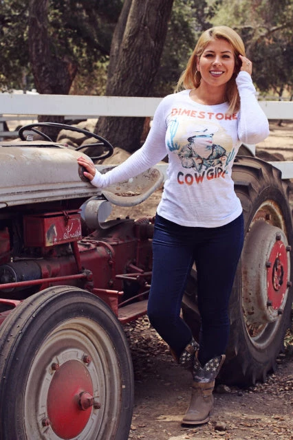 Take a trip through the American Southwest with this beautiful vintage-inspired Dimestore Cowgirl long sleeve thermal. Pair with your favorite jeans and layered with a jacket or vest! Designer Jess Snell, of Rockin’ B, was Inspired by vintage rodeo posters featuring saguaro cactus, cowgirl pulp novels, and 1940s/50s pinup girls, Jess blends her original illustrations with eye-catching graphics to create her one of a kind tee shirt designs.