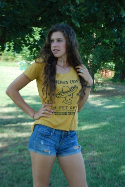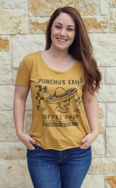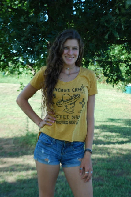 Original Cowgirl Clothing, Poncho’s Cafe Coffee Shop, Santa Fe, New Mexico stylish top brings contemporary flair with it’s tail drop hem and raw edge finish. You will love the hand of this fabric. This loose fit tee drapes softly from your shoulders and is both feminine and easy to wear.