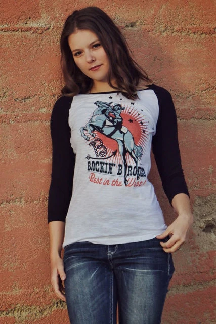 Inspired by vintage rodeo posters, cowgirl pulp novels, and 1940s/50s pinup girls, Rockin’ B Ranch designer Jess Snell blends her original illustrations with eye-catching graphics to create her one of a kind tee shirt designs.