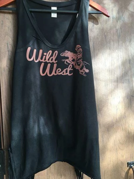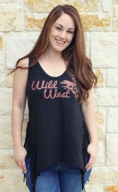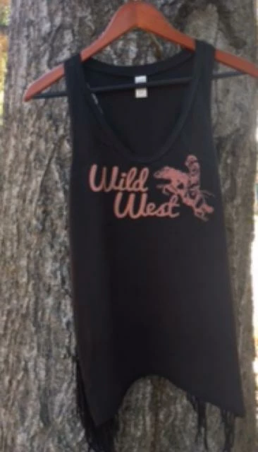 Wild West Fringe Tank features deep v-neck, hip side slit and fringe along hemline. Hip, fun! An Original Cowgirl Clothing design. Designed, printed, and produced in the USA.