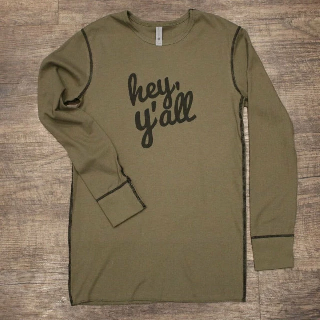Original Cowgirl Clothing, GTX Hey Y’all Graphic Thermal, is in a soft Olive Green with contrasting stitching for added southern charm. You will fall in love with this incredibly soft and warm micro-waffle thermal. Pair this fun thermal with your favorite jeans and don’t forget your boots!