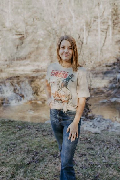 Wild West Circus Tee old school tee reads like a vintage marquee theater sign: See Madeline the World’s Famous Trick Rider. Southern Girls Troupe of Performing Ponies. With the look and feel of a vintage find, this soft comfortable tee will become your favorite go to tee. Dress it up or down, layer with a vest or jacket and add your favorite necklace.Designed, printed, and produced in the USA
