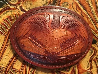 Trophy buckle featuring an eagle of leather in shades of brown.