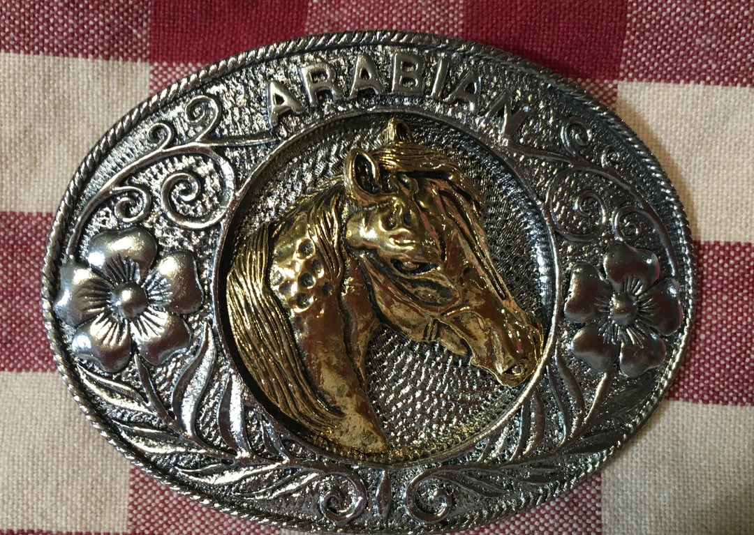 - Trophy oval buckle with three dimensional horsehead and the word “Arabian”