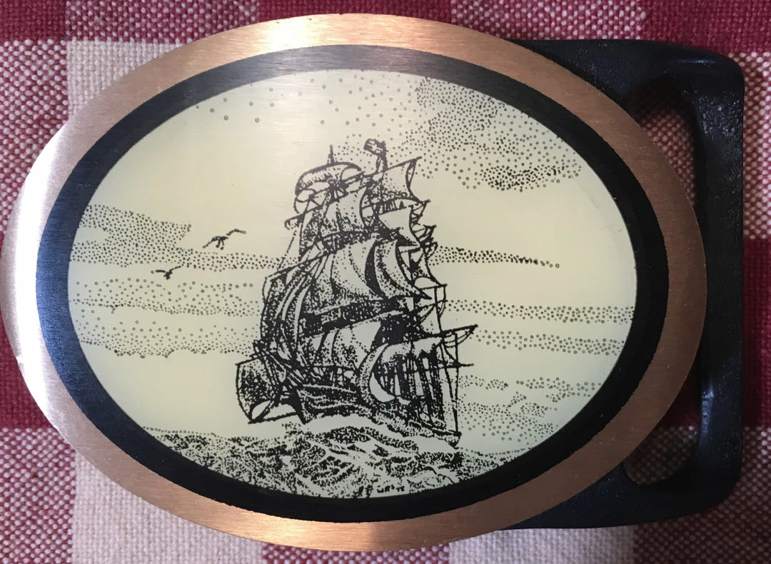 - Trophy oval buckle of a clipper ship against a faux scrimshaw background