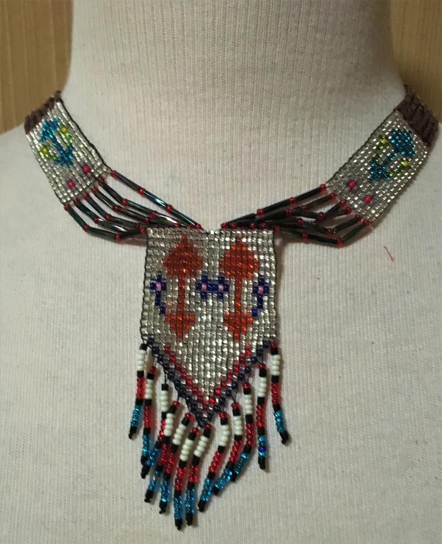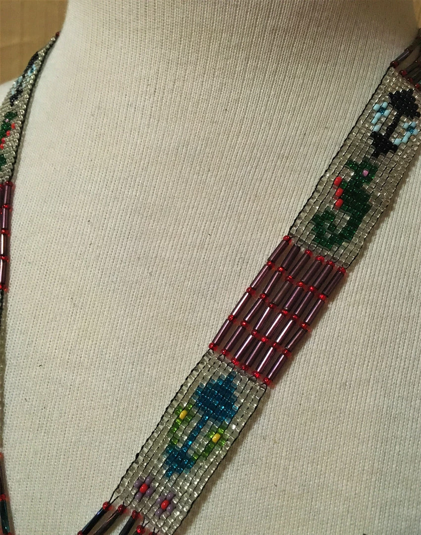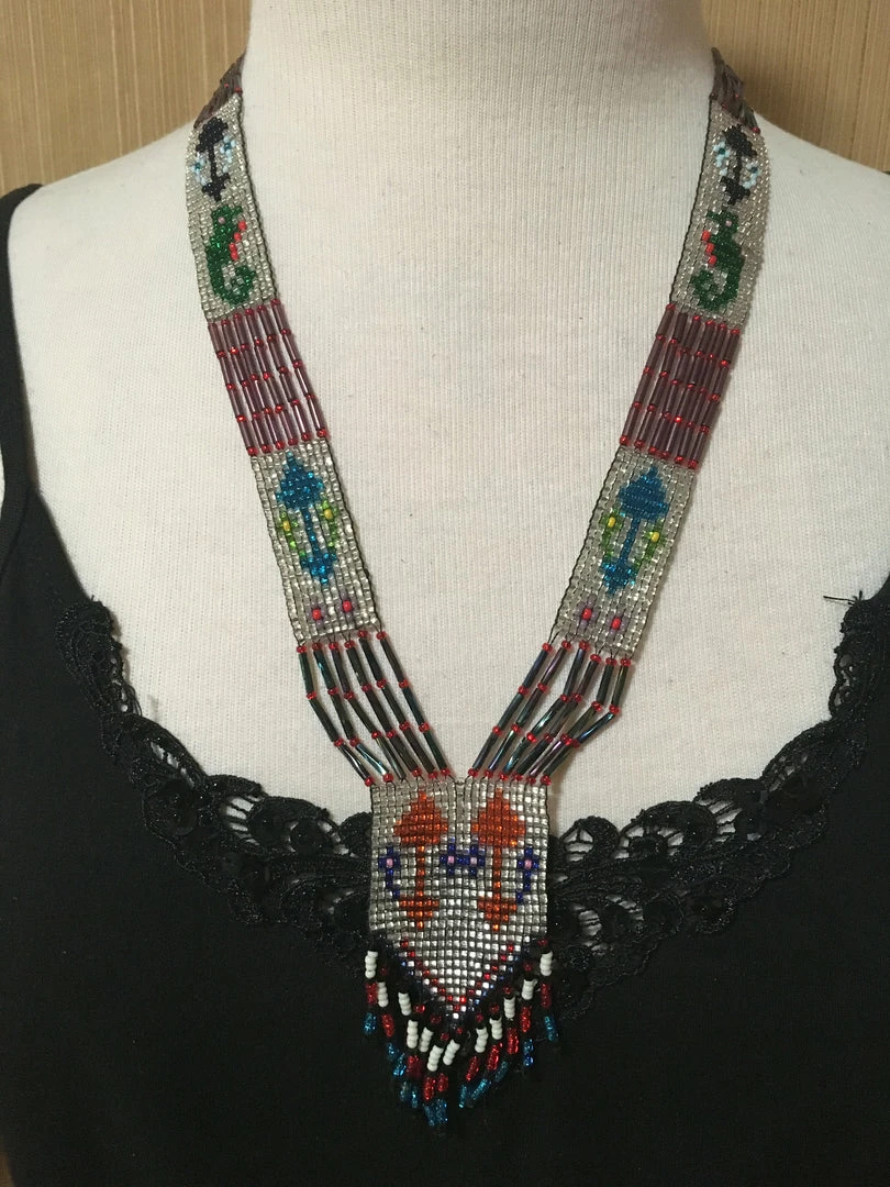 Multi Colored Beaded Necklace. Images include details of the necklace and pendant.