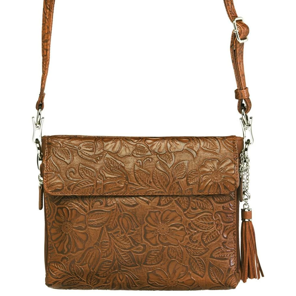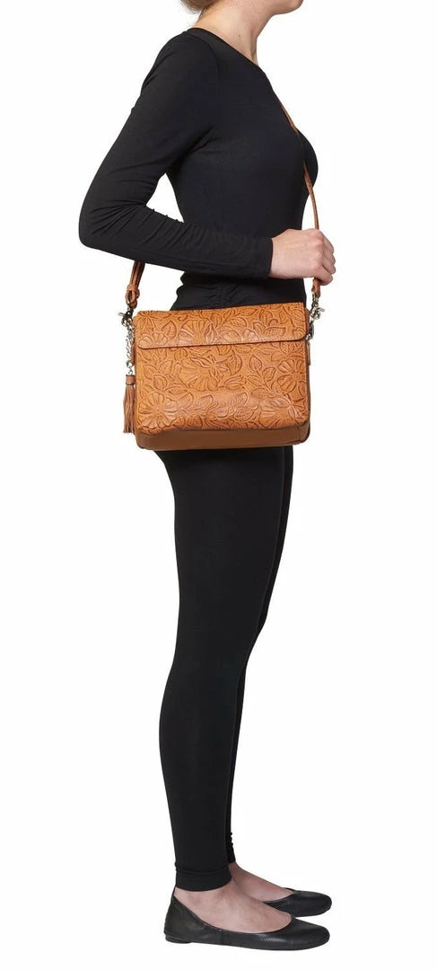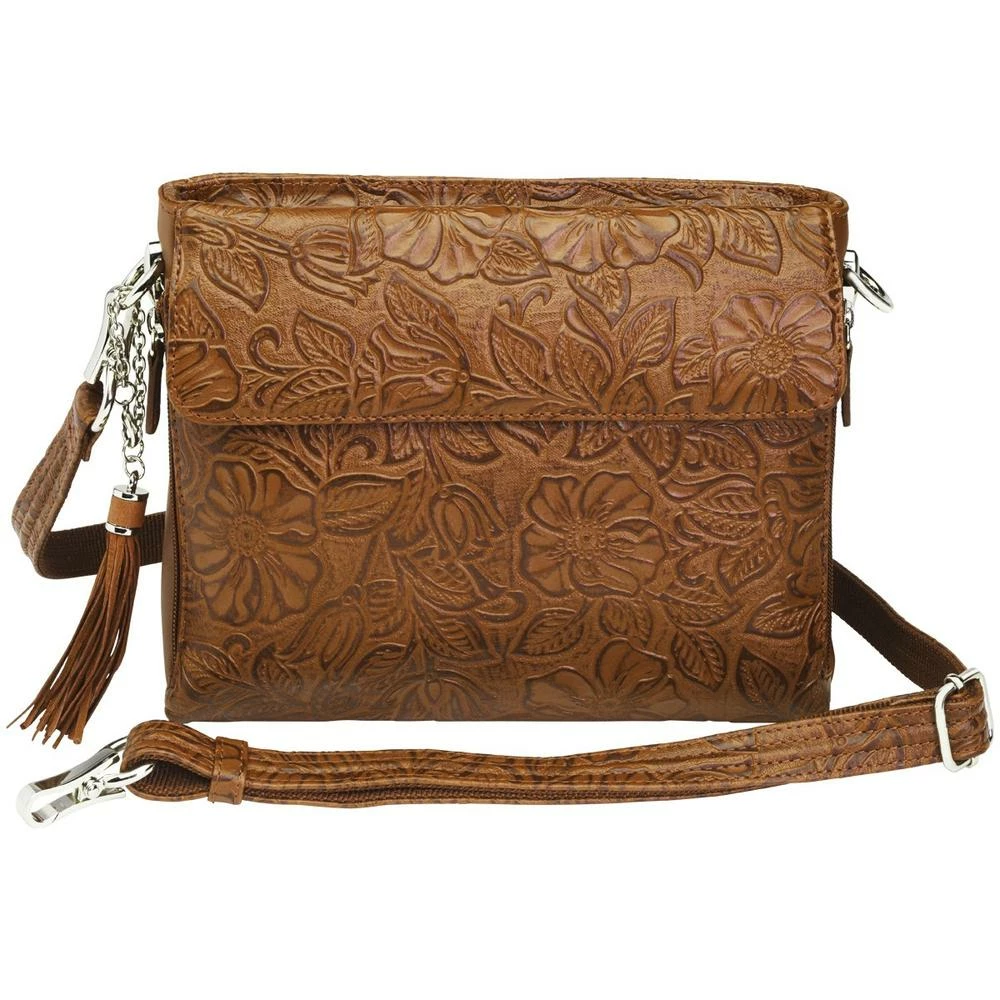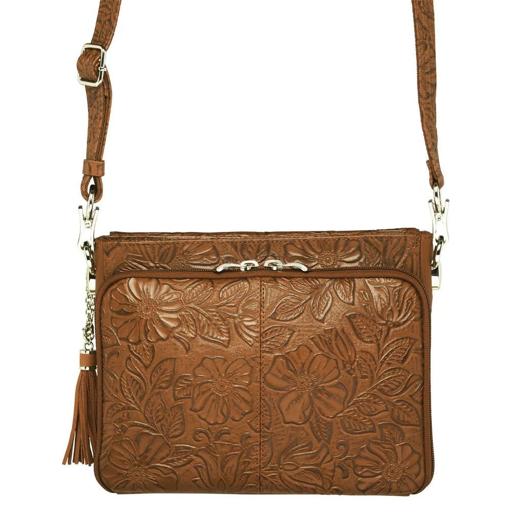 Hand carved mold creates this debossed understated Rose Leaf pattern. Hand rubbed color creates multi-tone highlights. Crafted of American cowhide, this leather will become even softer with use. The more this leather is used and handled the better it gets! Patina will darker with age. If you are looking for a striking and hard working bag that will hold your essentials – this is it! AND there’s another benefit – an additional compartment for concealed carry or to discreetly store your important documents like a passport, additional cash. or ID cards.