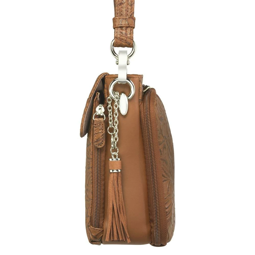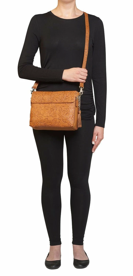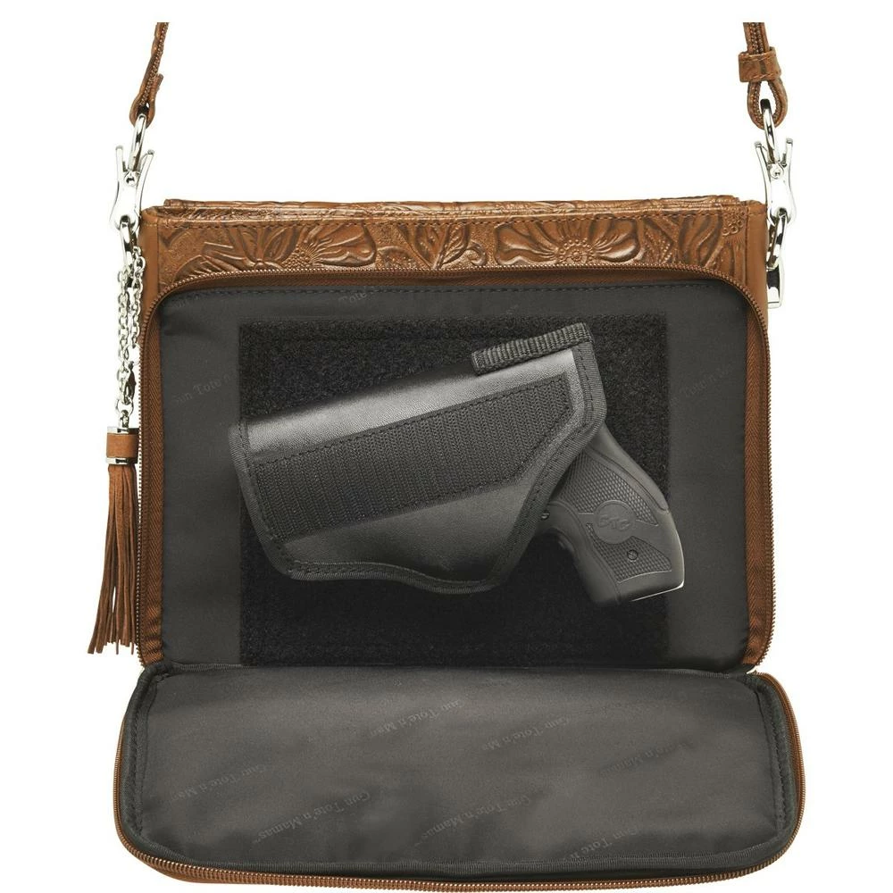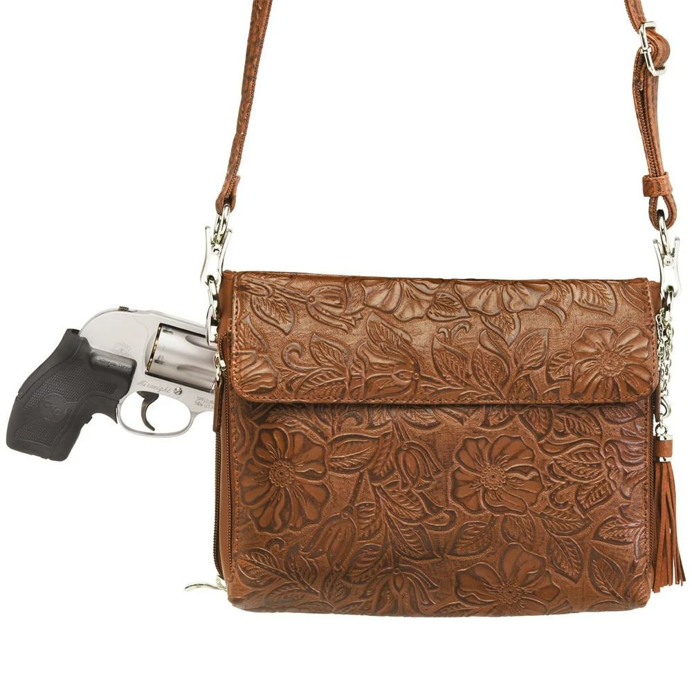 Hand carved mold creates this debossed understated Rose Leaf pattern. Hand rubbed color creates multi-tone highlights. Crafted of American cowhide, this leather will become even softer with use. The more this leather is used and handled the better it gets! Patina will darker with age. If you are looking for a striking and hard working bag that will hold your essentials – this is it! AND there’s another benefit – an additional compartment for concealed carry or to discreetly store your important documents like a passport, additional cash. or ID cards.