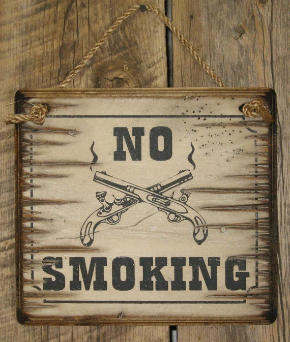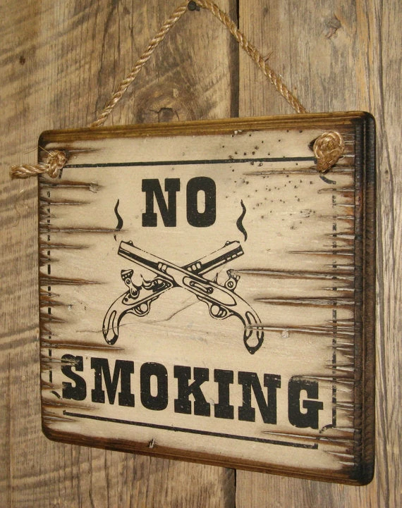 No Smoking. Sounds like a pretty plain request! Handmade of pine and distressed to look weathered, crossed smoking guns support the simple request, “No Smoking.”