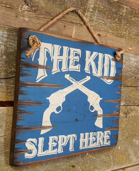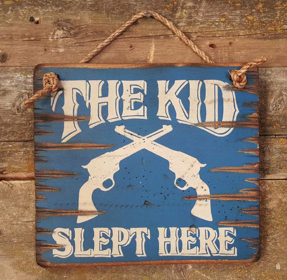 Distressed blue background give this wall sign an antique look. Measures 12″ x 12″