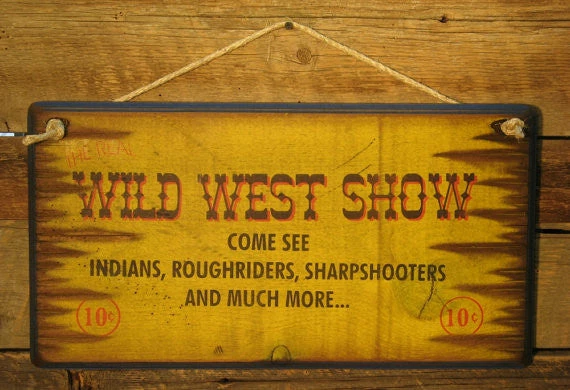 Wild West Show. Come see Indians, Roughriders, Sharpshooters, and Much More. Handmade of pine and distressed to look weathered, bright yellow background.