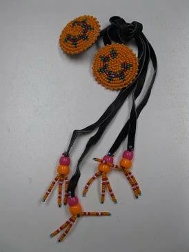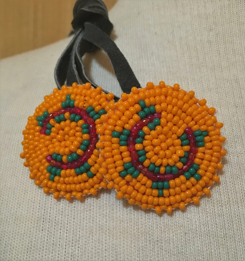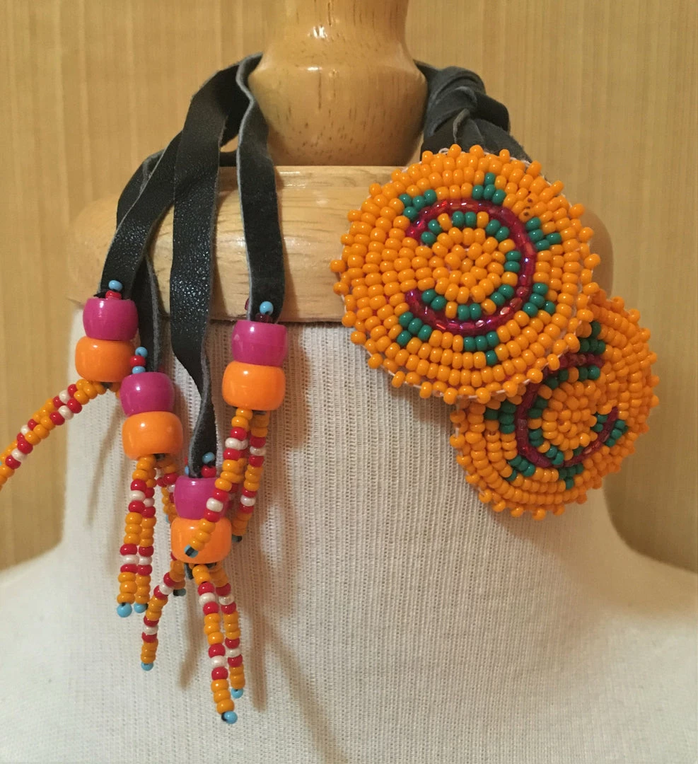 Hair tie pair is unique and one-of-a-kind. Circle of orange beads with green accent beads and a touch of dark pink shimmer beads. Backed on leather with black leather ties, beaded ends of orange and fuchsia. Made in the USA.