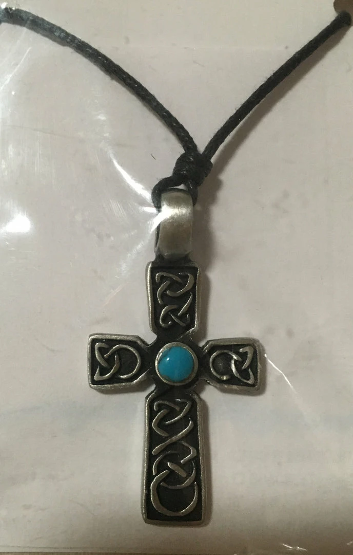Handcrafted by the folks at Kraftworks Studio, a family owned craft studio, established in 1979, located in rural West Virginia. Each item features their own exclusive beautifully cast lead-free Celtic Cross charm with blue center that has been sterling silver plated. Suspended on 18″ leather cord. All findings are quality sterling and sterling plated. Handmade in the USA.