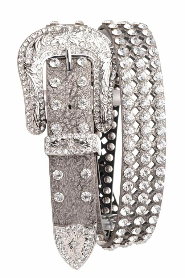 Fashion forward pewter leather belt features three rows of clear crystals. So pretty, you’ll love the look to dress up or down your favorite pants, legging, skirts, and dresses.