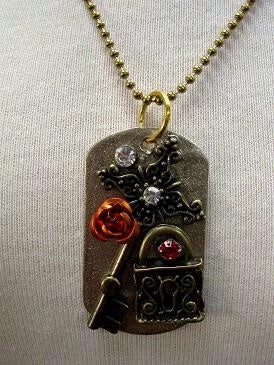 Charming “dog tag” embellished with brass tone key and lock with a touch of bling. Gold tone chain is 30″ long, dog tag pendant is 1.5″ x 1.” Each component was selected by the jewelry designer and hand applied. Adjustable length. Made in the USA.